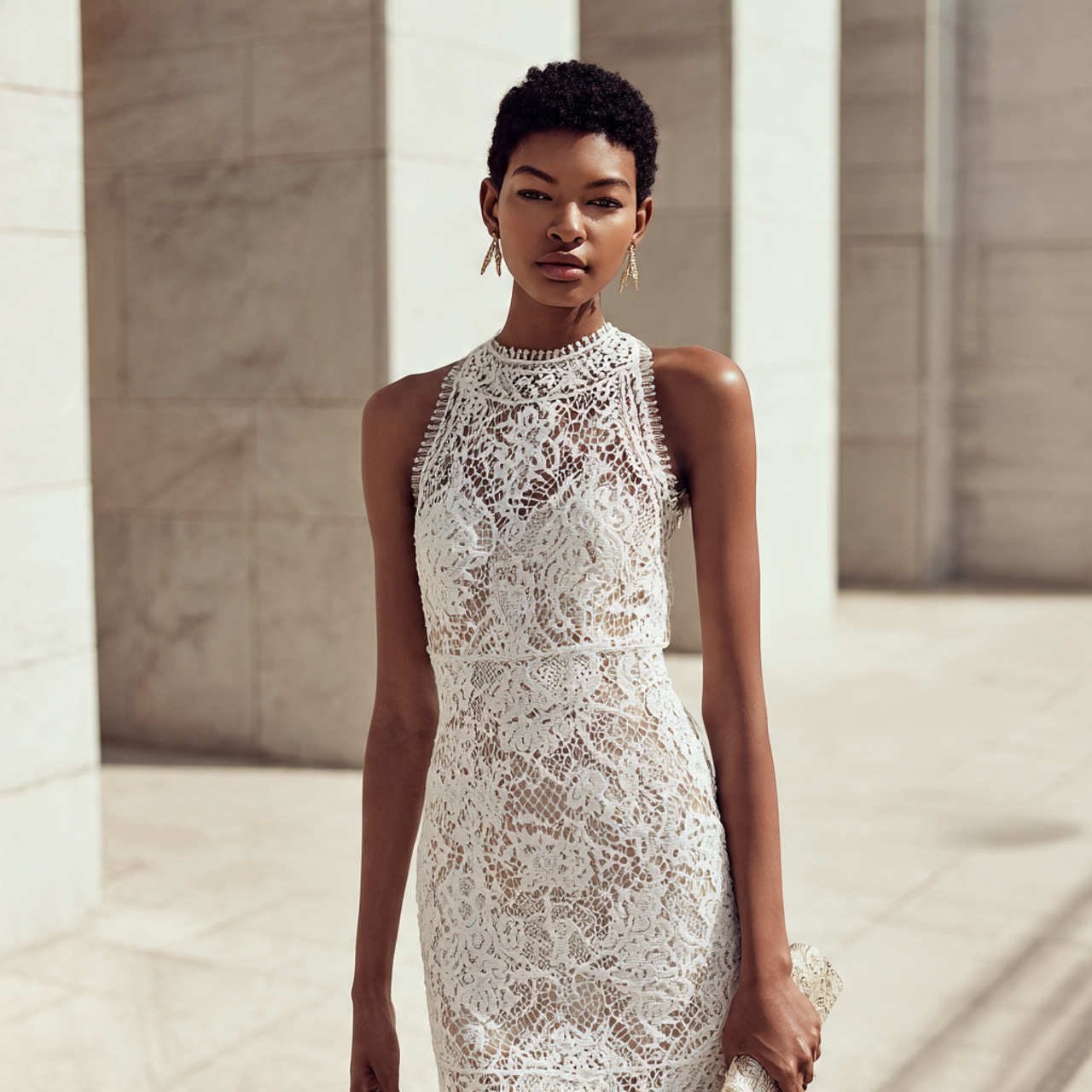 Choose fine lace patterns instead of chunky designs. Dresses with lace panels or subtle embroidery often look more refined than fully embellished ones.