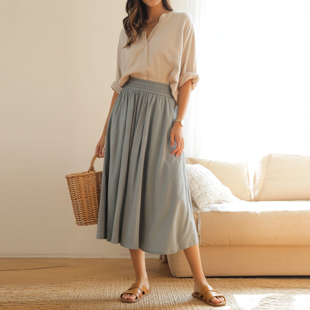 If you enjoy skirts, this outfit is perfect for everyday wear. A relaxed skirt paired with a casual blouse gives you comfort while still feeling feminine and put together.