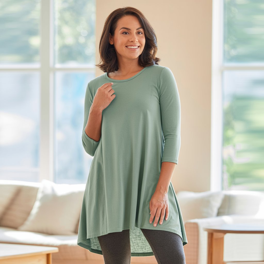 Choose tunics that are long enough for coverage and made from breathable fabric. Pair them with leggings for a relaxed look or straight trousers for a slightly neater appearance. This is one of those outfits that feels good from morning to evening.
